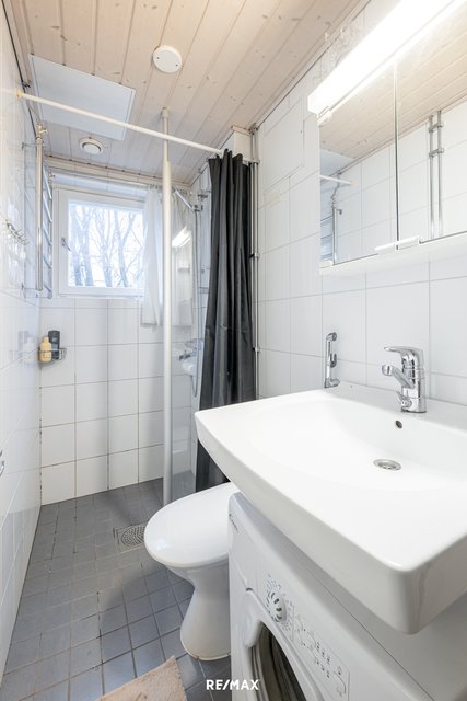 - - WC - Suihku - Suihkuseinä - Allas - Pyykinpesukone - Peilikaappi - Käsisuihku Lattia: laatta Seinät: laatta