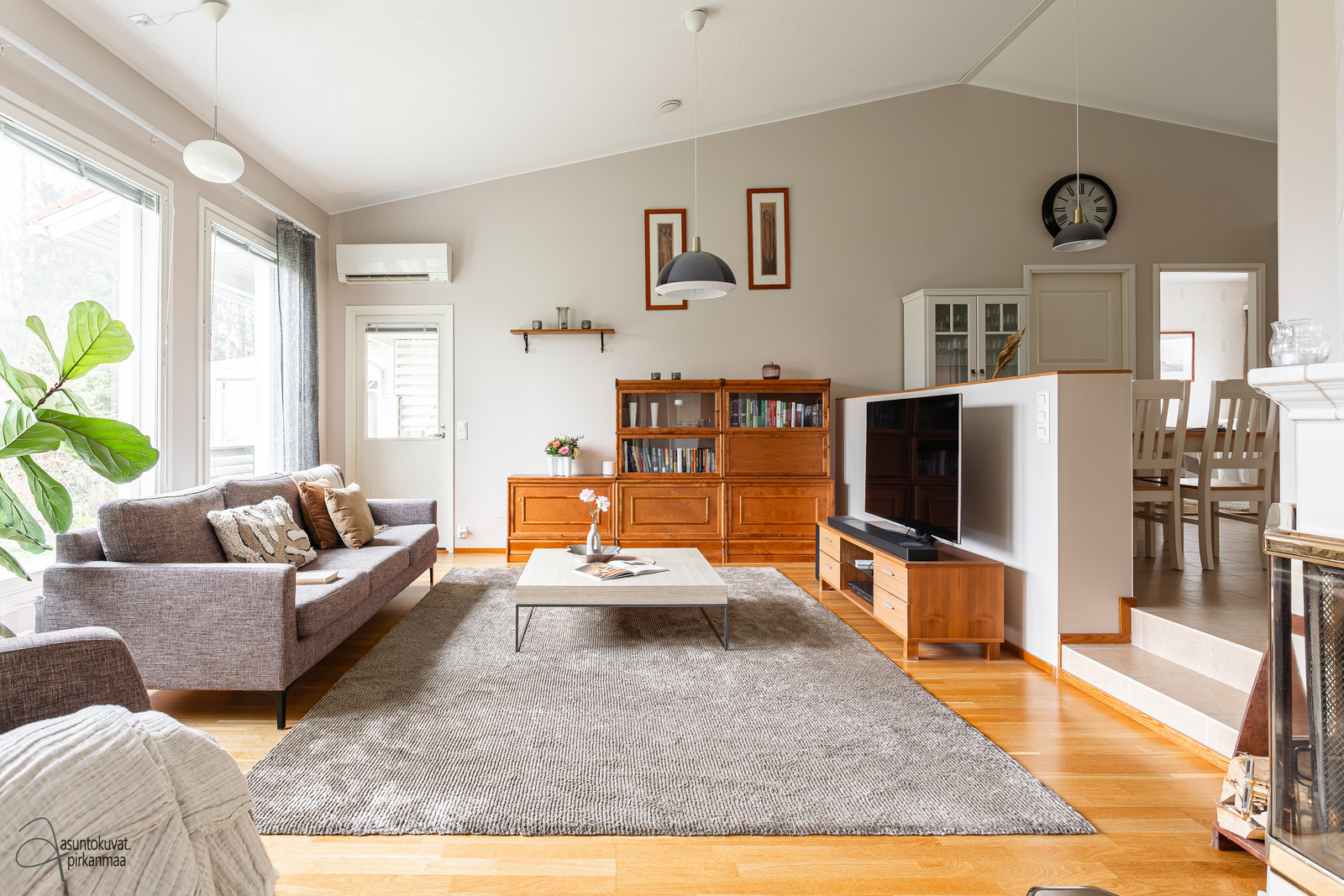 Avarassa olohuoneessa on korkea huonekorkeus ja varaava takka luovat lämpimää tunnelmaa. Olohuoneesta avautuu käynti vehreälle takapihalle, josta löytyy terassi ja lämmin varasto. Keittiö on remontoitu tyylikkäästi vuonna 2023 ja tarjoaa erinomaiset puitteet niin arkeen kuin juhlaankin.