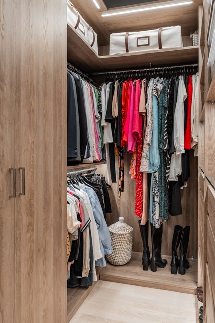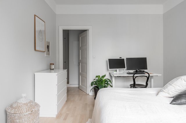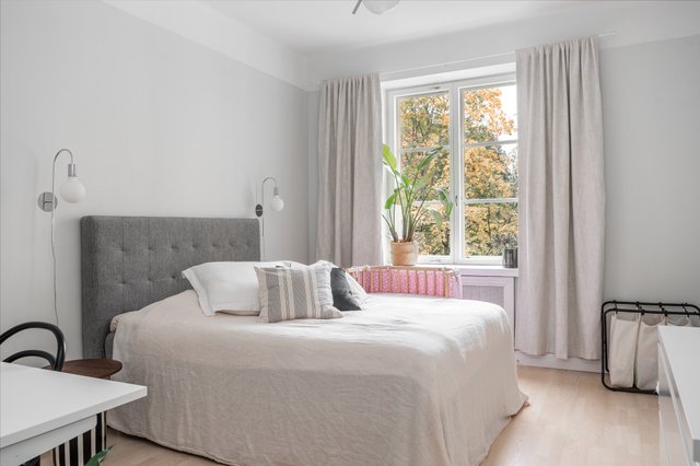 Molemmat makuuhuoneet ovat tilavia ja avaria, ja niiden ikkunat avautuvat vehreälle sisäpihalle. Toisessa makuuhuoneessa on reilusti kaappitilaa, ja lisäksi käytössä on erillinen vaatehuone, joka on varustettu kotimaisen Inarian mittatilauskaapistoilla. Myös toisen makuuhuoneen ja eteisen kaapistot ovat Inarian, ja ne tarjoavat runsaasti säilytystilaa.