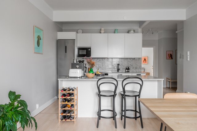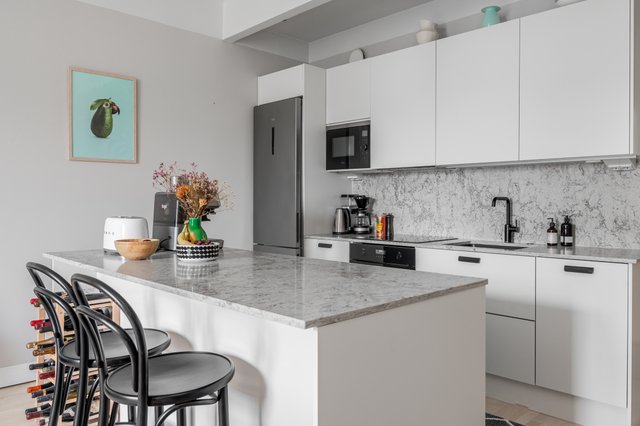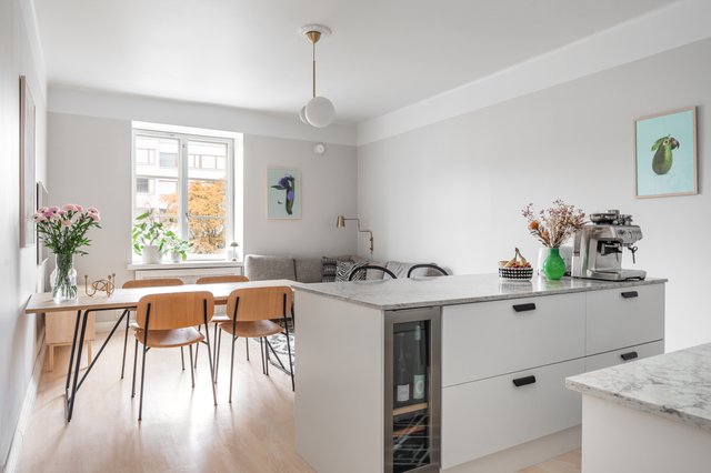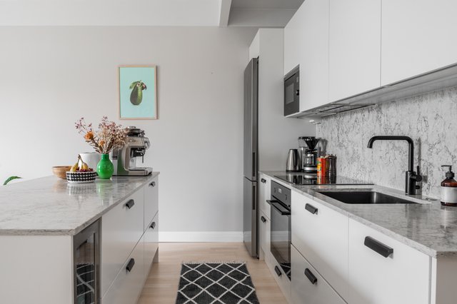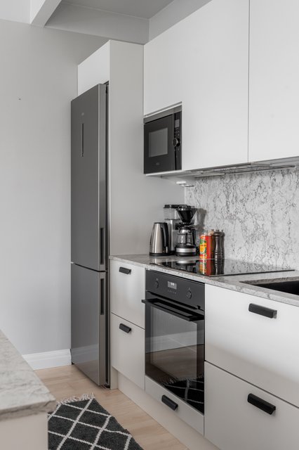 Keittiö on uusittu vuonna 2021 laadukkain materiaalein ja kodinkonein. Kvartsitasot, integroidut AEG:n kodinkoneet ja saareke, jossa on runsaasti säilytystilaa sekä viinikaappi, tekevät keittiöstä sekä toimivan että tyylikkään. Oleskelutila ja keittiö muodostavat yhtenäisen ja valoisan kokonaisuuden, jossa on tilaa ruokailulle ja rentoutumiselle.