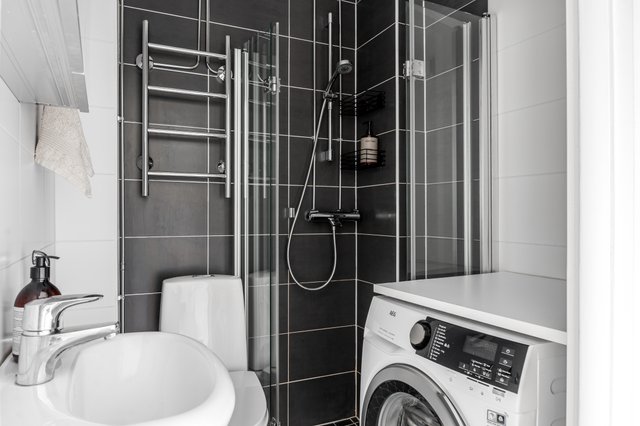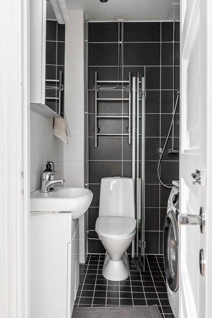 Kylpyhuone on nykyaikainen ja kompakti, ja sinne mahtuu hyvin myös pyykinpesukone. Tummat ja vaaleat laattapinnat luovat modernin ja selkeän ilmeen.