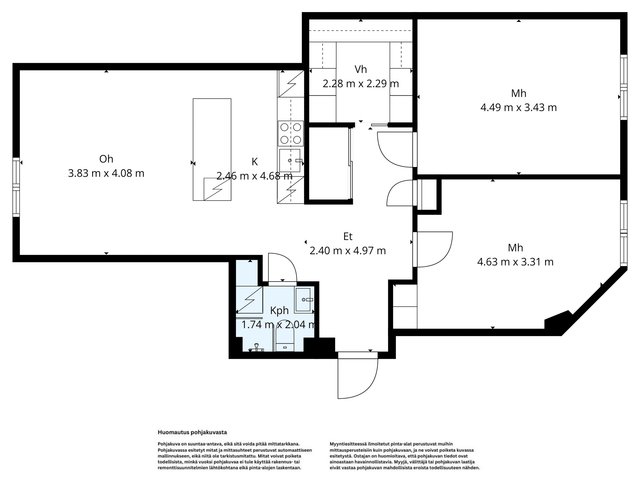 - Kohteen markkinoinnissa käytetään mittatiedoilla varustettua pohjapiirrosta. Pohjapiirroksen tarkoitus on helpottaa ostajan ostopäätöstä ja selvittää asunnon nykyinen huonejako. Lukija on tietoinen, että pohjakuva on suuntaa antava, ei mittakaavassa, eikä perustu virallisiin piirustuksiin. Pohjapiirroksessa näkyvät mitat on luotu automaattisesti 3D-skannauksesta (leveys x pituus), eikä niiden oikeellisuutta ole tarkistettu. Pohjapiirroksessa näkyvät mitat ovat suuntaa antavia ja ne voivat näin ollen poiketa todellisista mitoista. Mitat tulee tarkistaa esimerkiksi remonttia suunniteltaessa. Mittauskohdat on merkitty kuvaan pienillä kolmioilla. Välitysliike, myyjä, eikä pohjakuvan laatija ole vastuussa, mikäli pohjakuvan mittasuhteet eivät todellisuudessa vastaa pohjakuvassa mainittuja mittasuhteita. Lukijan on tärkeää ymmärtää, että mittasuhteet voivat heittää kuvassa mainitusta enemmän tai vähemmän. Myytävän kohteen pinta-alatiedot selviävät myyntiesitteestä, eikä pohjakuvan mittatietojen pohjalta voida laskea/olettaa muita pinta-alatietoja.