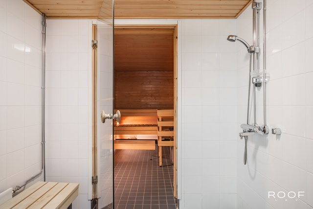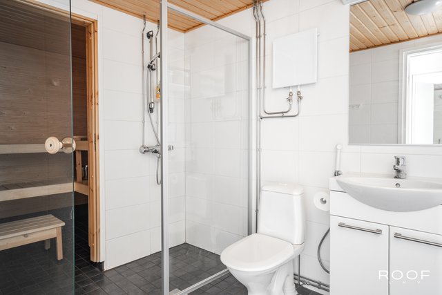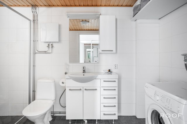 - WC-istuin, suihku, bidee-suihku, suihkuseinä, pesukoneliitäntä, lattialämmitys, peili, ja kylpyhuonekaapisto