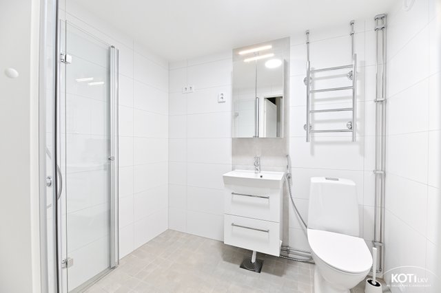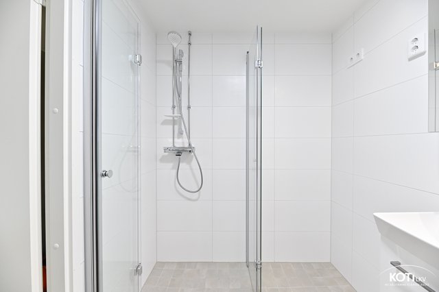- Uusi, kaunis kph (LVIS-saneerauksen yhteydessä uusittu 2025) Varustus: suihku, kääntyvä suihkuseinä, peilikaappi, pyykinpesukoneliitäntä, rättipatteri