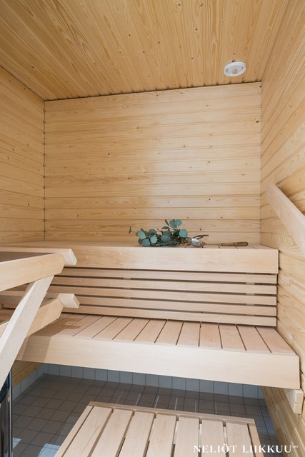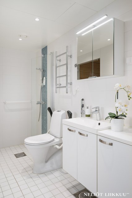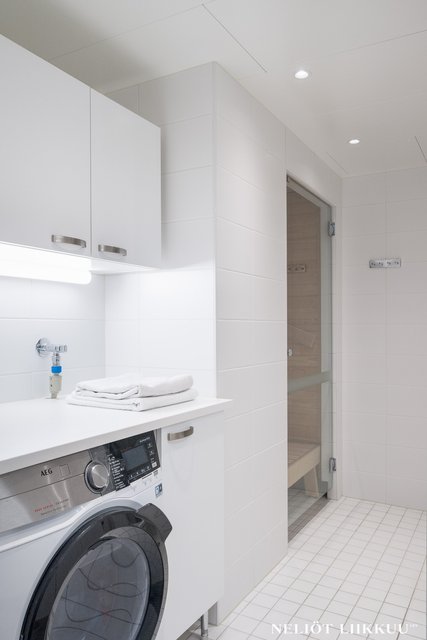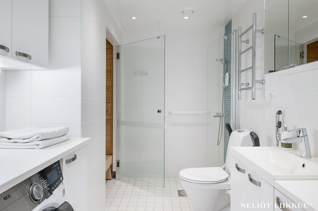 - Varustus: suihku, suihkuseinä, allas ja allaskaappi, peilikaappi, wc-istuin, bidee-suihku, kuivauspatteri, kylpyhuonekaapistot, pöytätaso, pesukoneliitäntä, sähkökäyttöinen lattialämmitys.