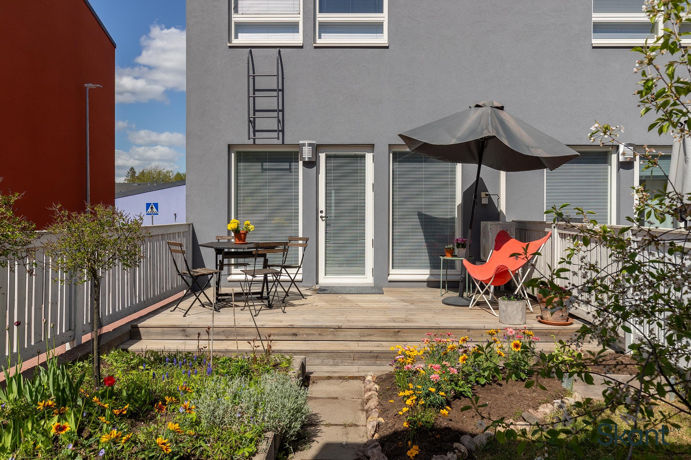 Takapihan suojaisa terassipiha kasveineen tarjoaa upeat puitteet kesäpäivien viettoon, ja aidatun pihan perältä löytyy asunnon oma ulkovarasto.