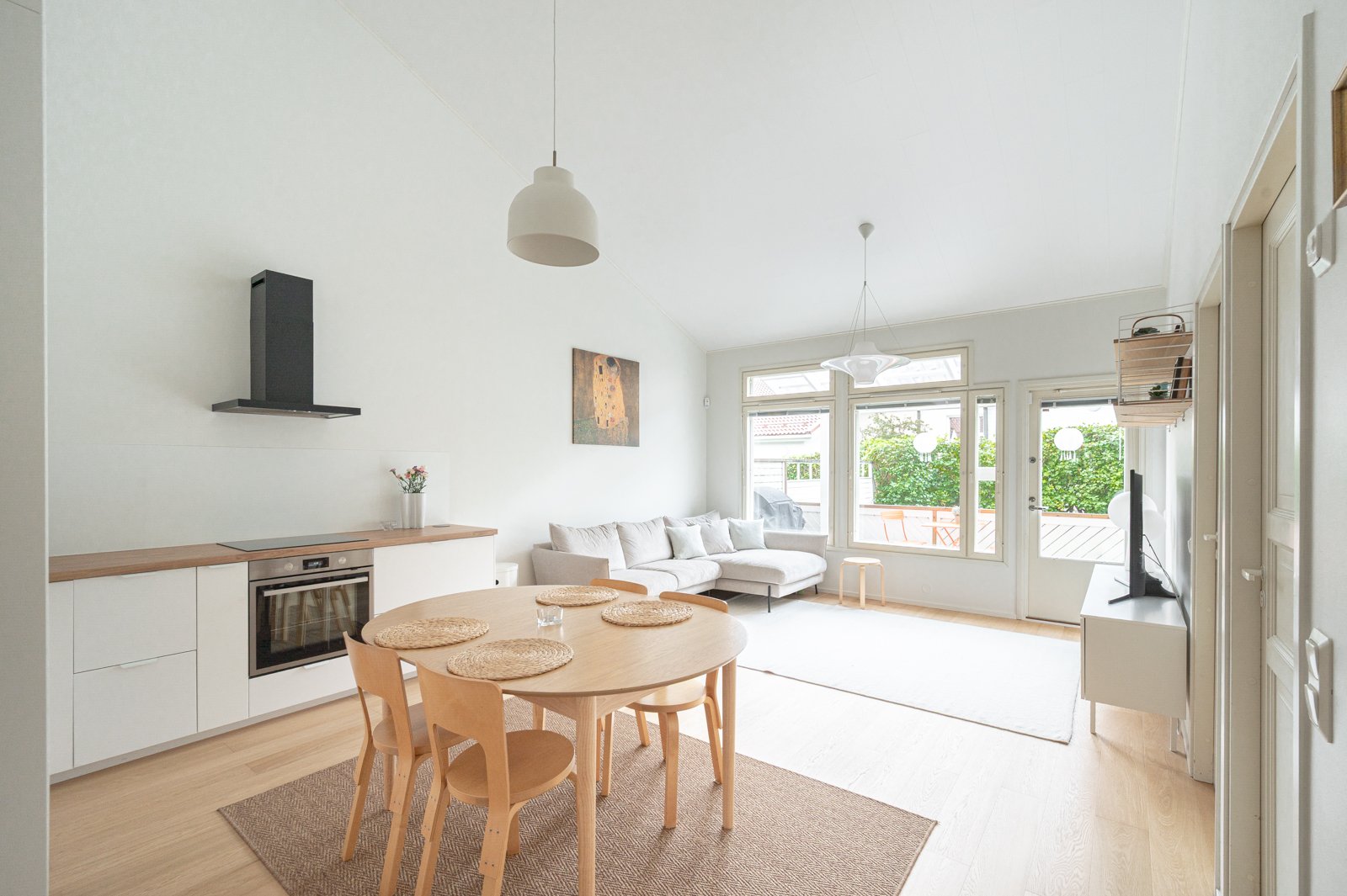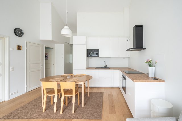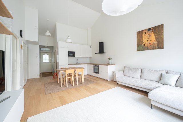 Jo sisään astuessa katse kiinnittyy huikeaan huonekorkeuteen ja tiloihin tulvivaan luonnonvaloon. Tyylikäs, vaalea avokeittiö on uusittu vuonna 2023 ja yhdistyy saumattomasti ruokailutilaan ja olohuoneeseen, josta on suora käynti omalle terassille ja suojaisalle piha-alueelle. Yhtenäinen laadukas kovapuulattia ja neutraalit sävyt luovat harmonisen tunnelman ja tarjoavat loistavan pohjan sisustamiselle.