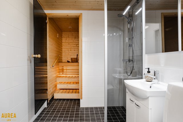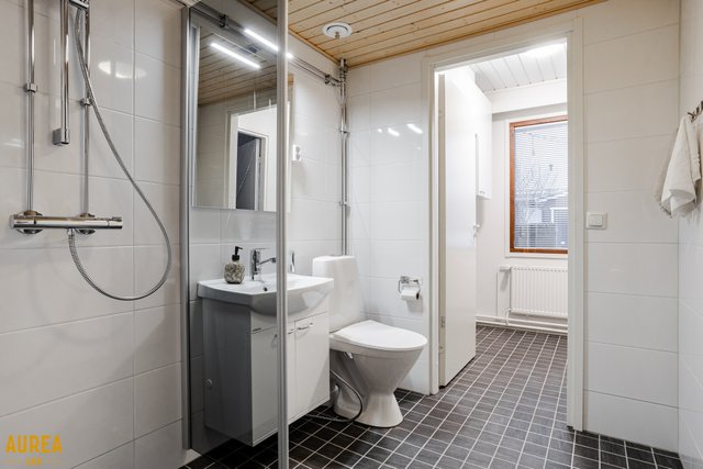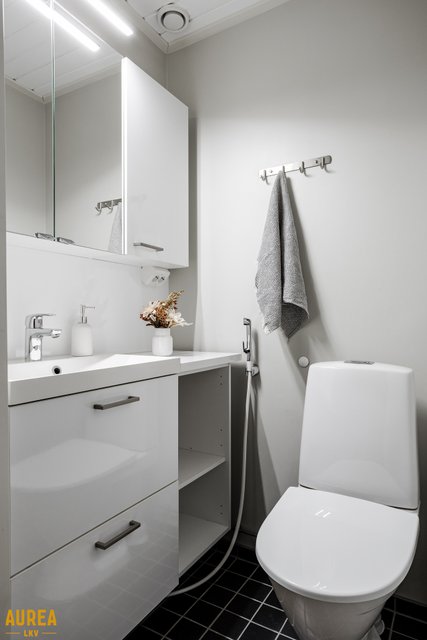 - WC-istuin, suihku, suihkuseinä, lattialämmitys, peili, pesuallas, allaskaappi, ja bidee-suihku