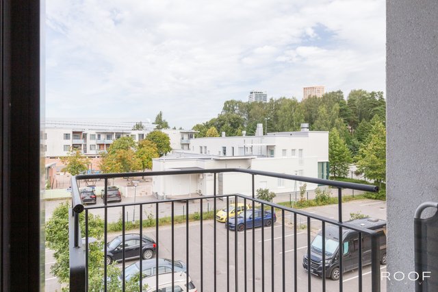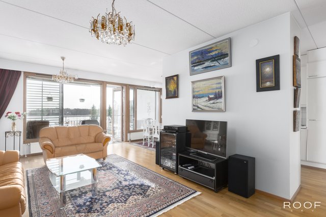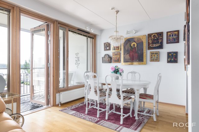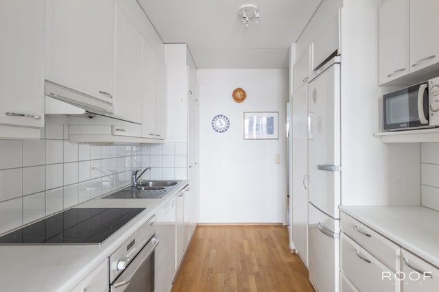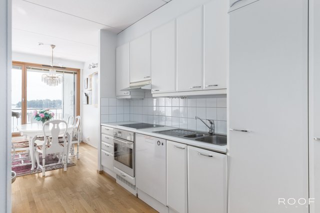 Eteisestä aukeaa olohuoneen ja ruokailutilan avara kokonaisuus, josta käynti myös lasitetulle parvekkeelle. Keittiö, jossa reilusti säilytystilaa jää mukavasti seinän taakse omaksi tilakseen.