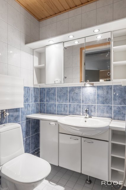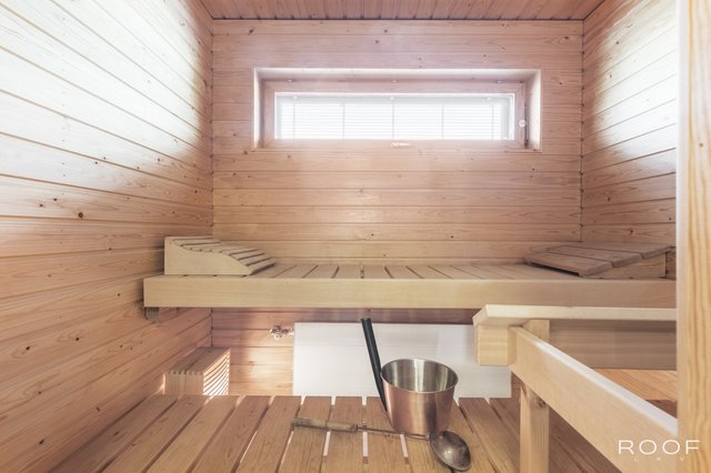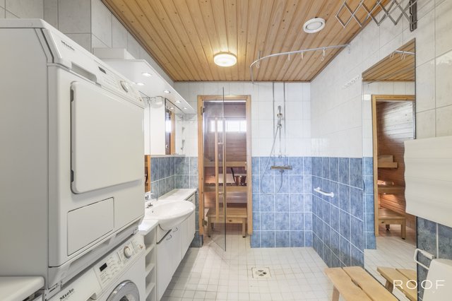Tilavaan kylpyhuoneeseen mahtuu hyvin myös pyykkihuolto ja oman saunan löylyistä pääset nauttimaan aina halutessasi! Erillinen wc sujuvoittaa arkea.