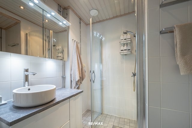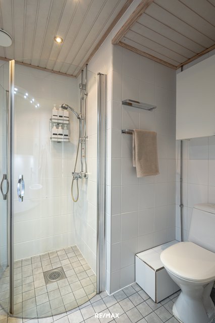 - WC-istuin, suihkuseinä (taitettava), pesukoneliitäntä, lattialämmitys, peilikaappi, allaskaappi, ja kylpyhuonekaapisto
