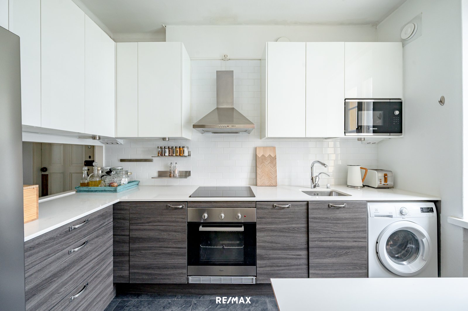 - Domus-keittiö. Pyykinpesukone sijoitettu keittiöön.
