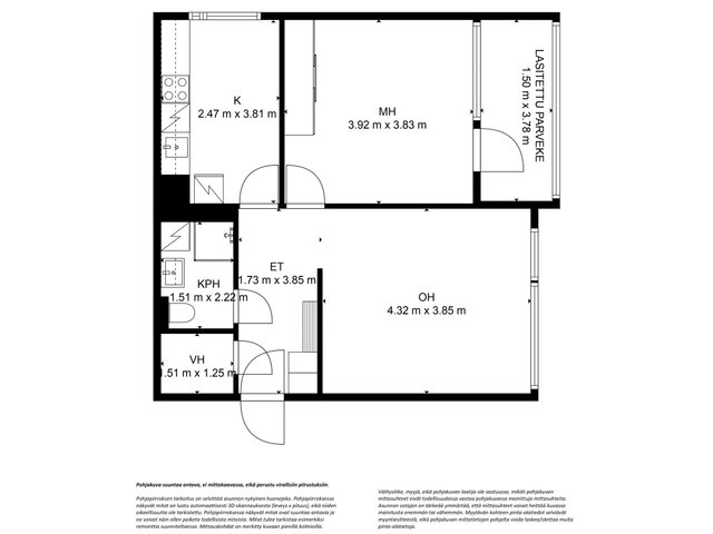 - Yhtiöjärjestyksen mukainen, Isännöitsijäntodistuksen mukainen, (Pinta-ala ei ole tarkistusmitattu ja todellinen pinta-ala voi olla suurempi tai pienempi, kuin ilmoitettu)