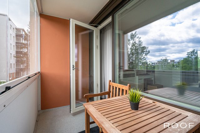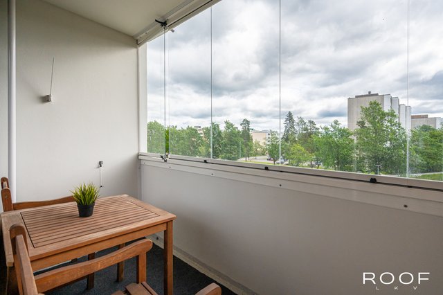 - Avarat puistomaiset näkymät asunnon olohuoneesta sekä makuuhuoneen lasitetulta parvekkeelta itään sekä keittiöstä pohjoisen suuntaan.