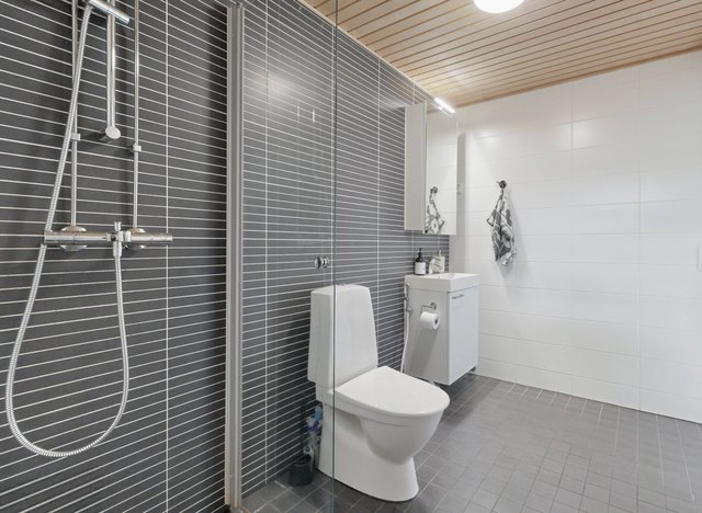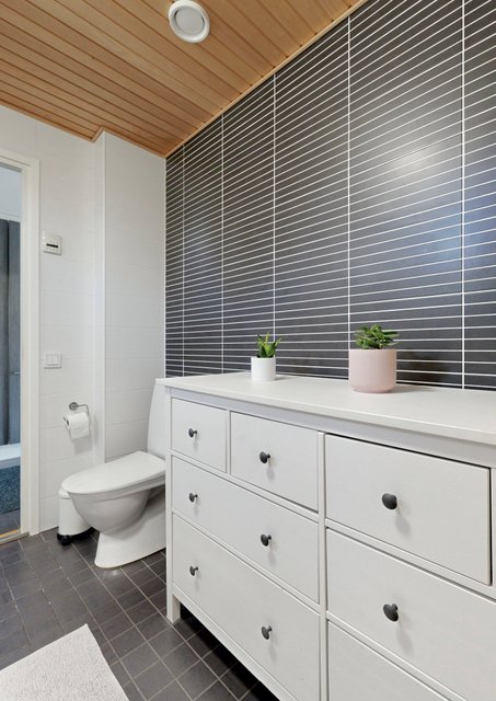 - VARUSTUS: Suihku, Suihkuseinä, WC-istuin, Allaskaappi, Hana, Peilikaappi, Lattialämmitys. SEINÄ: Laatta. LATTIA: Kaakeli.