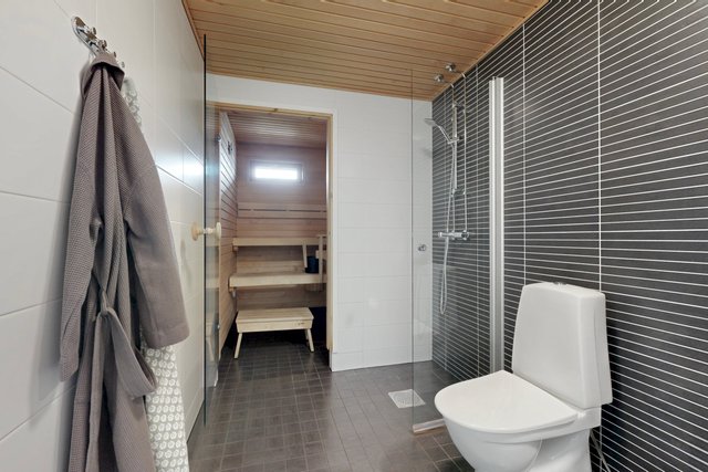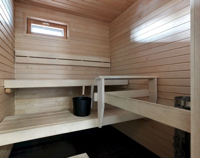 - VARUSTUS: Sähkökiuas. SEINÄ: Puu. LATTIA: Kaakeli.