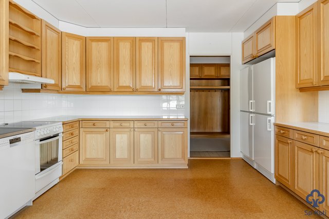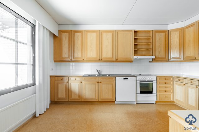 - Kaapistot, jääkaappipakastin, jääviileäkaappi, keraaminen liesi, liesituuletin, astianpesukone. Työtasot laminaattia, korkkilattia.