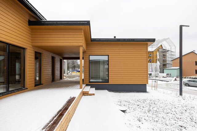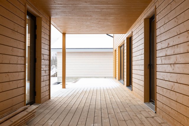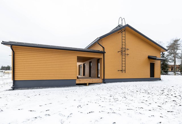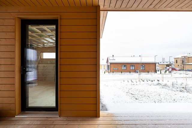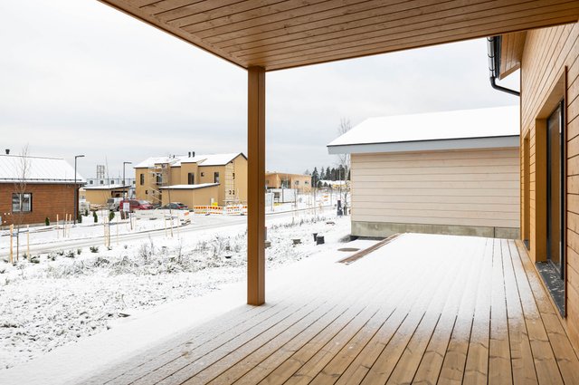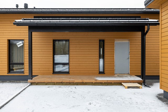 - Sisääntulon yhteydessä ja iso osin lasitettu terassi oleskelupihalle, talon ja saunarakennuksen välissä.