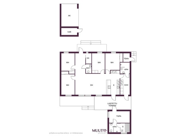 - Pinta-alat perustuvat myyjältä saatuihin tietoihin ja rakennuspiirustuksista laskettuihin arvioihin. Pinta-aloja ei ole tarkistusmitattu, mitattaessa pinta-alat saattavat olla ilmoitettua suurempia tai pienempiä. Hinta ei ole pinta-alaperusteinen. Rakennuspiirustusten mukainen asuinrakennuksen huoneistoala 125 m² ja kerrosala 141 m², saunarakennuksen huoneistoala 21 m² ja kerrosala 26 m² sekä ulkoiluvälinevaraston kerrosala 8 m². Asuintilojen pinta-ala on laskettu rakennuspiirustuksista ja siihen on huomioitu kaikki asuinkäytössä olevat tilat, mukaan lukien saunarakennuksen asuintilat. Muihin tiloihin on laskettu varasto ja tekninen tila.