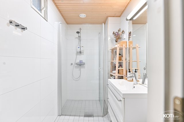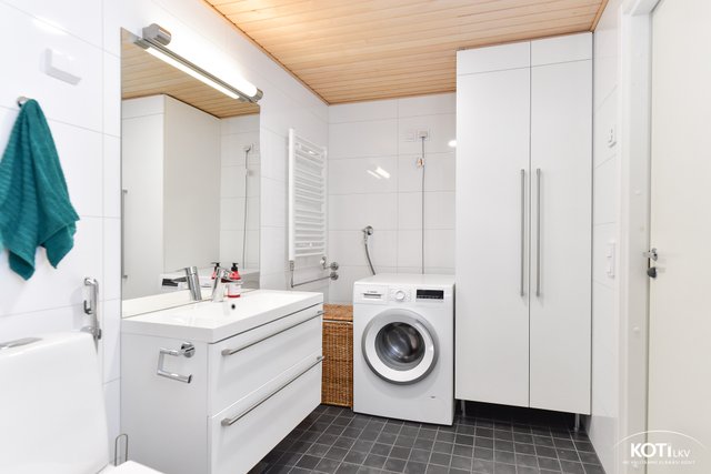 - WC-istuin, suihku, pesukoneliitäntä, suihkuseinä, lattialämmitys, peili, pesuallas, ja allaskaappi