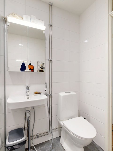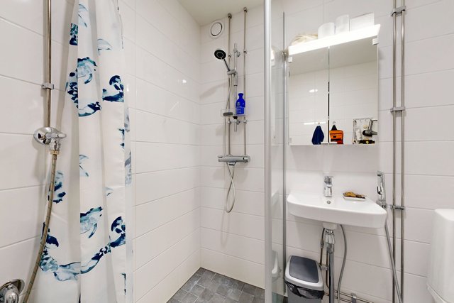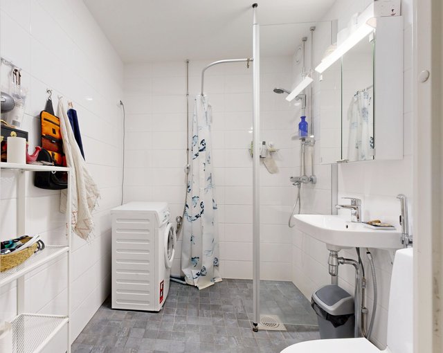 - VARUSTUS: Suihku, Suihkuseinä, WC-istuin, Pesukoneliitäntä, Hana, Allas, Peilikaappi, Allaskaapisto, Lattialämmitys (sähkö). SEINÄT: Kaakeli. LATTIA: Laatta.