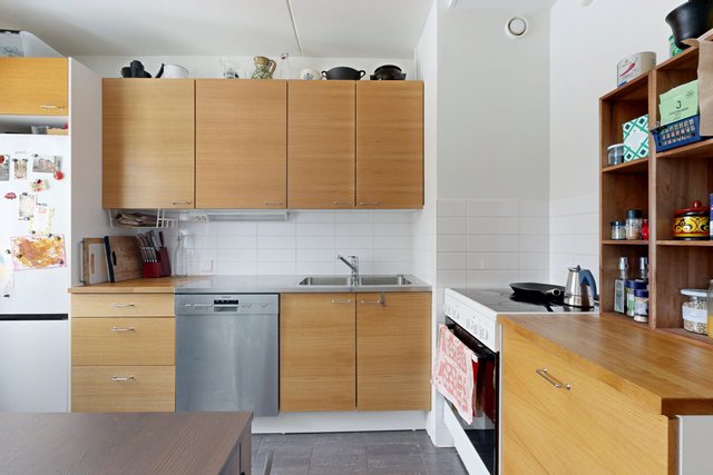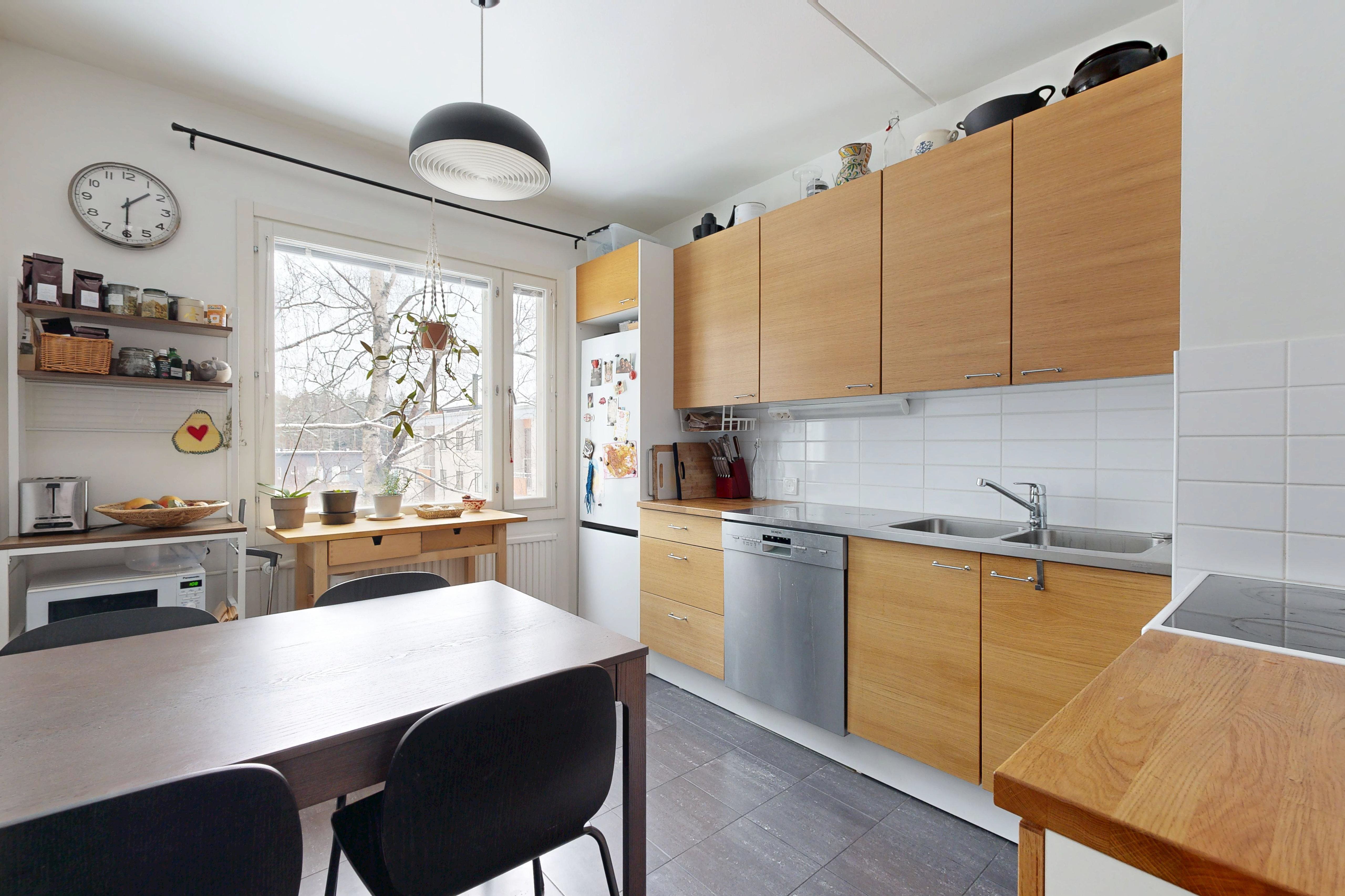 - VARUSTUS: Keraaminenliesi, Hana, Kaapisto, Allas, Astianpesukone, Jääkaappipakastin, TASOT: Puu. SEINÄT: Laatta välitila. Maalattu. LATTIA: Laatta.