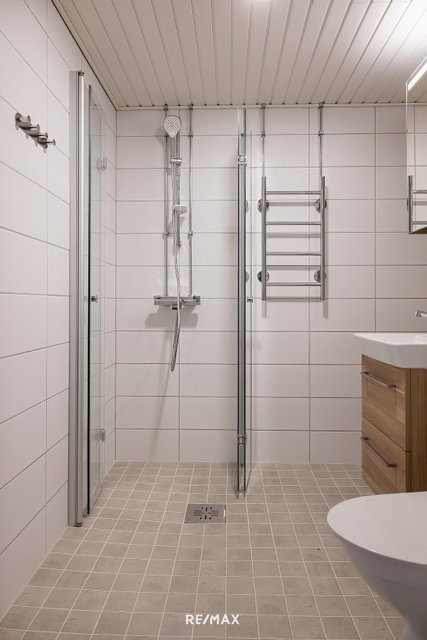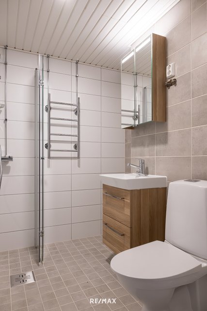 - WC-istuin, suihku, suihkuseinä, pesukoneliitäntä, lattialämmitys, peilikaappi, pesuallas, allaskaappi, bidee-suihku, ja pyyhekuivain