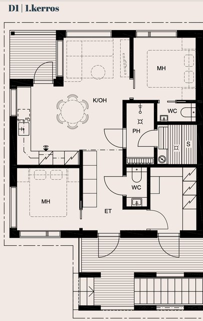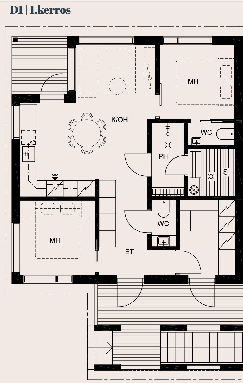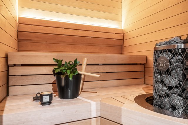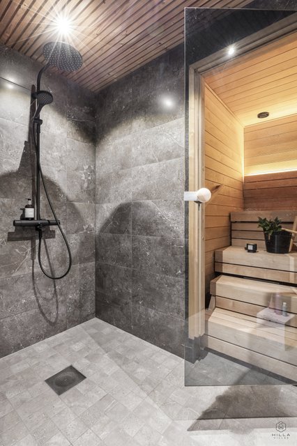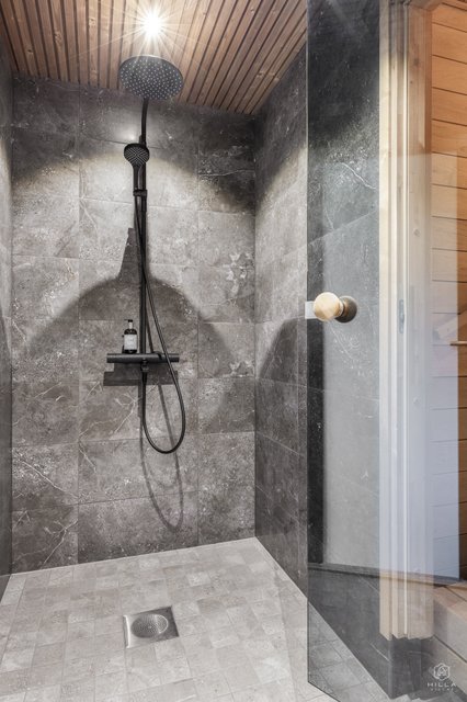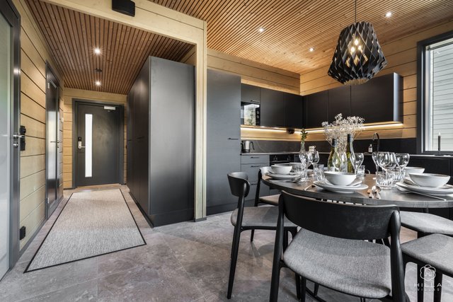The apartment's tile floors and log panel walls create a warm and stylish atmosphere. The apartment has two bedrooms, one of which has its own toilet, adding a touch of everyday luxury to living. The fully equipped kitchen includes an induction cooktop and integrated dishwasher, and the private sauna and balcony complete the package – the perfect place to relax after a day of activities.