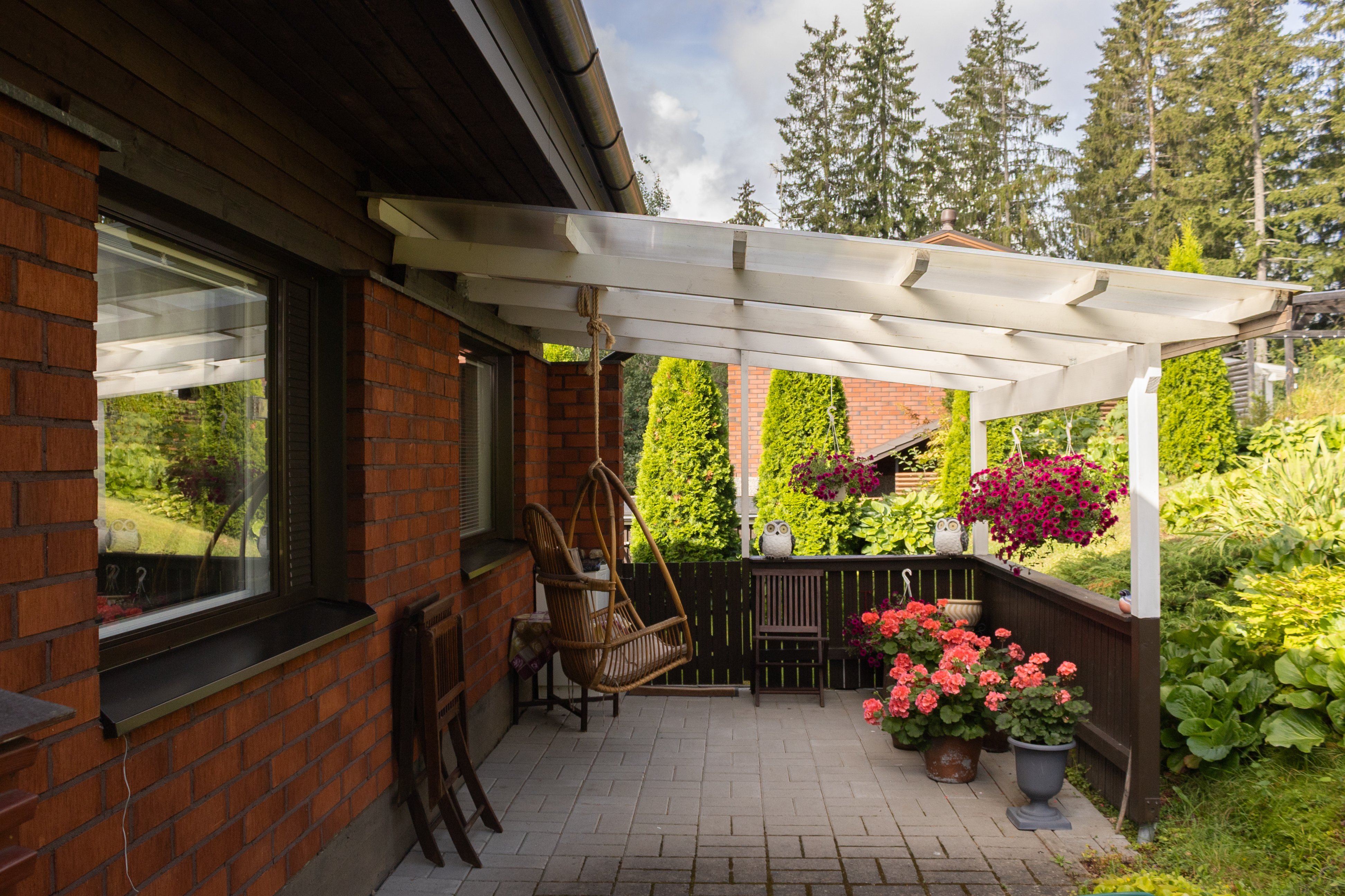 - Talon takapihalla pihakivistä tehty katettu terassi.