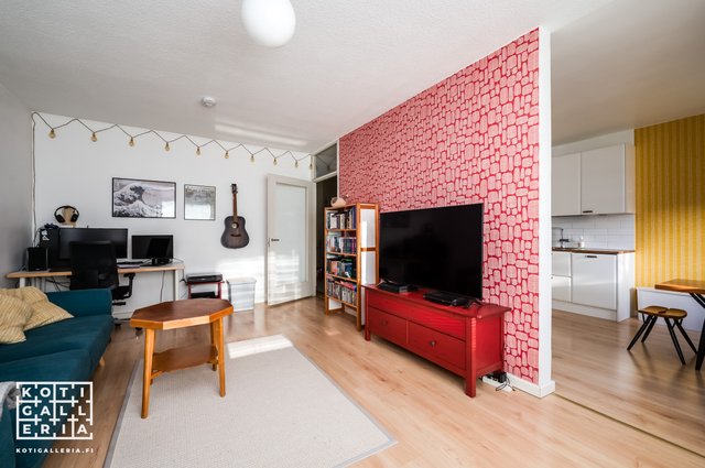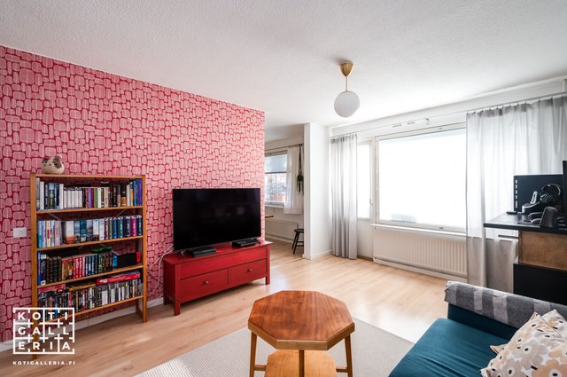 - Olohuoneessa kaunis tehostetapetointi yhdellä seinällä. Muut seinät maalipinnalla. Olohuone on tilava ja helppo sisustaa mieluisaksi.