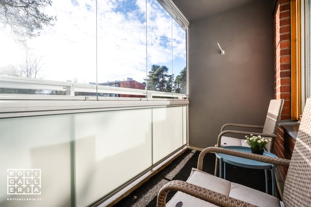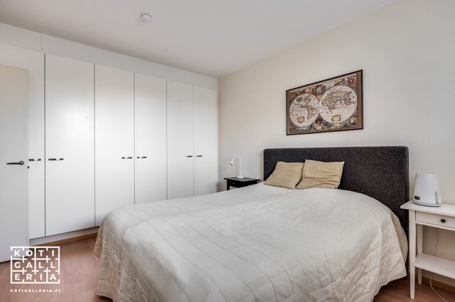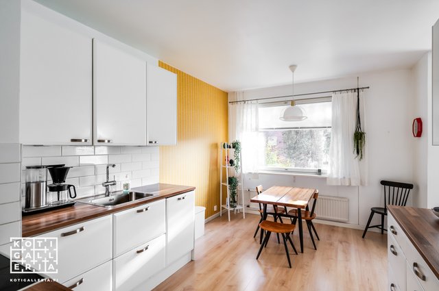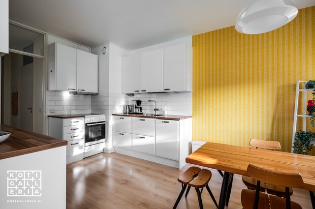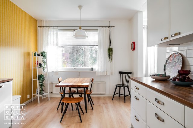 Asunnon keittiö on uusittu vuonna 2013 laadukkailla Novartin kalusteilla. Olohuone on tilava ja sen kaunis tehostetapetti luo tyylikkään ilmeen. Makuuhuoneessa on runsaasti säilytystilaa uusittujen kaapistojen ansiosta. Hyvän kokoiseen kylpyhuoneeseen mahtuu hyvin oma pyykinpesukonekin.