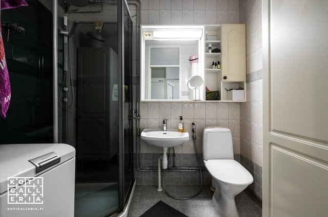 - WC-istuin, suihku, suihkukaappi, pesukoneliitäntä, peili, pesuallas, ja bidee-suihku