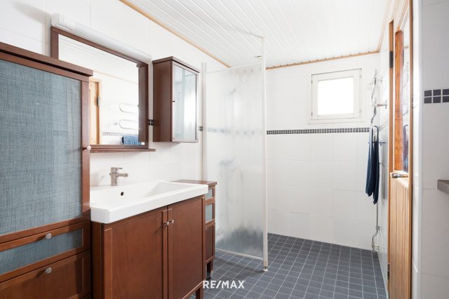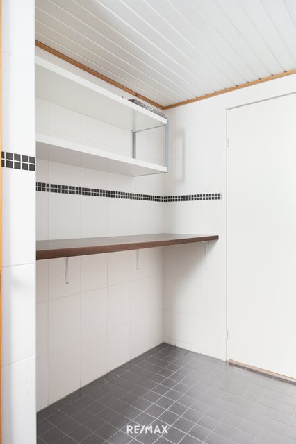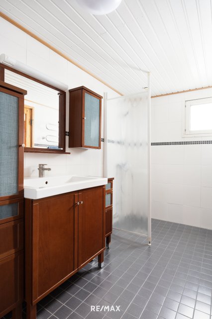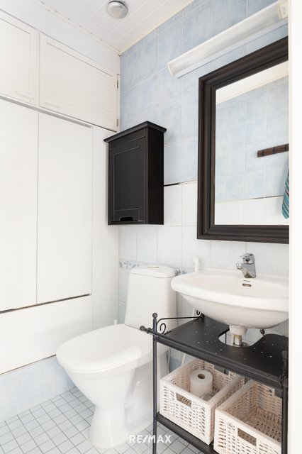 - Kylpyhuone on remontoitu vuonna 2007. Kylpyhuoneen huolto ja saumojen uusiminen on tehty 10/2025. (Vevex) Varusteet: lattialämmitys, suihku, suihkuseinä, pyyhekuivain, peili, allaskaapisto, pesukoneliitäntä.