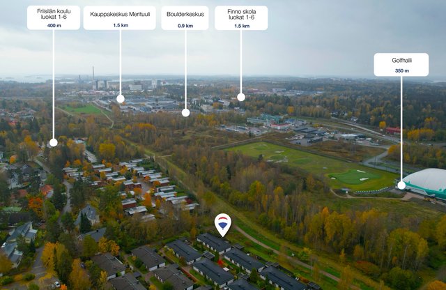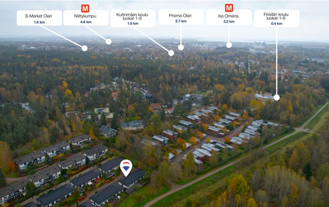 Tervetuloa Friisilän viihtyisälle pientaloalueelle luonnon helmaan, hyviä palveluita unohtamatta. Läheinen Friisilän koulu on pieni - mutta runsaasti kehuttu noin 150 oppilaan alakoulu vain muutaman minuutin kävelyn päässä ilman yhtäkään tien ylitystä. Lähistöltä löytyy myös ruotsinkielinen alakoulu, johon pyöräilee noin 5 minuutissa. Lukuisia päiväkoteja suomeksi, englanniksi ja ruotsiksi, myös vuorohoidolla. Julkiset yhteydet ovat vähintäänkin kohtuulliset, sillä yhtiön edustalta lähtevältä bussipysäkiltä kulkee arkisin suora 27 minuutin bussilinja Kamppiin sekä muita linjoja läheisille metroasemille, joiden avulla matkustusaika pysyy edelleen noin puolessa tunnissa. Holmankuja sijaitsee HSL -vyöhykkeiden rajalla ja kuuluu vielä B -vyöhykkeeseen. Kauppakeskus Iso Omena, Olarin 24h Prisma sekä Suomenojan palvelut tarjoavat lukuisia vaihtoehtoja vain muutaman minuutin automatkan päässä. Keskuspuiston ja Puolarmaarin ulkoilualueen läheisyys antaa paljon mahdollisuuksia liikkuvalle perheelle. Lähin hiihtolatu kulkee kirjaimellisesti kivenheiton päässä.