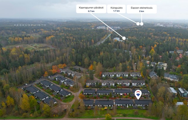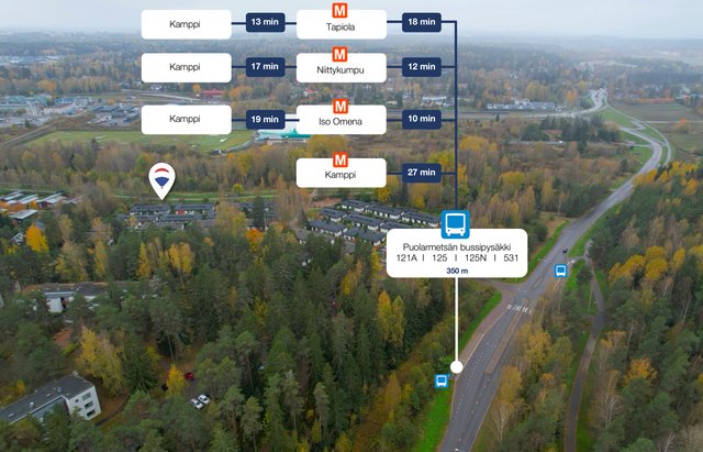 - 350 m - Puolarmetsän bussipysäkki. Linjat: 121A / 125 / 125N / 531 >> 10 min - Kauppakeskus Iso Omena (M) >> 12 min - Niittykumpu (M) >> 18 min - Tapiola (M) >> 27 min - suora yhteys Kamppiin
