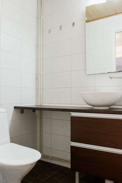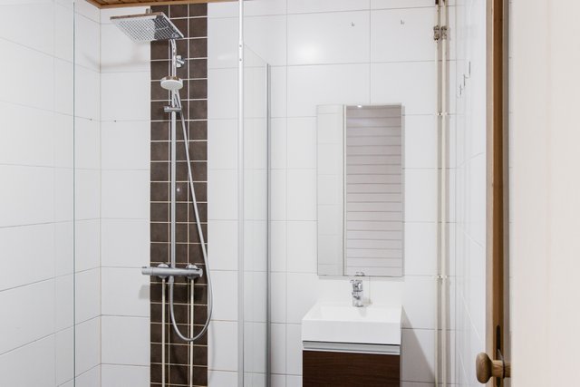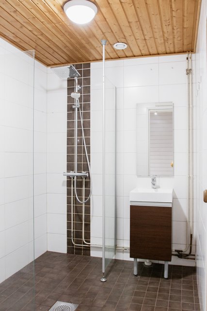 - Suihku, allaskaappi, suihkuseinä, lattialämmitys, ja pesukoneliitäntä