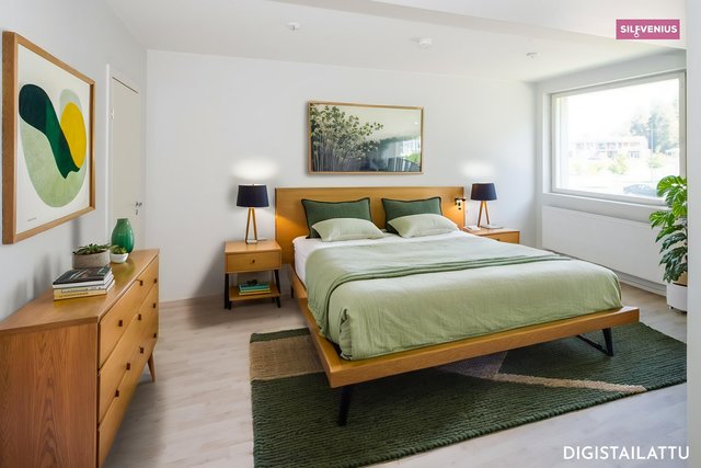 Asunnon pohjaratkaisu on toimiva ja tilava. Avoin keittiö on varusteltu laadukkailla kodinkoneilla, ja olohuoneessa on runsaasti tilaa perheen yhteisiin hetkiin. Kaksi makuuhuonetta tarjoavat rauhallisen levon paikan. Kylpyhuoneessa on lattialämmitys ja oma sauna, joka tuo arkeen ripauksen luksusta.