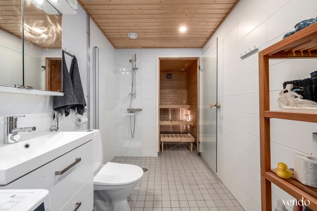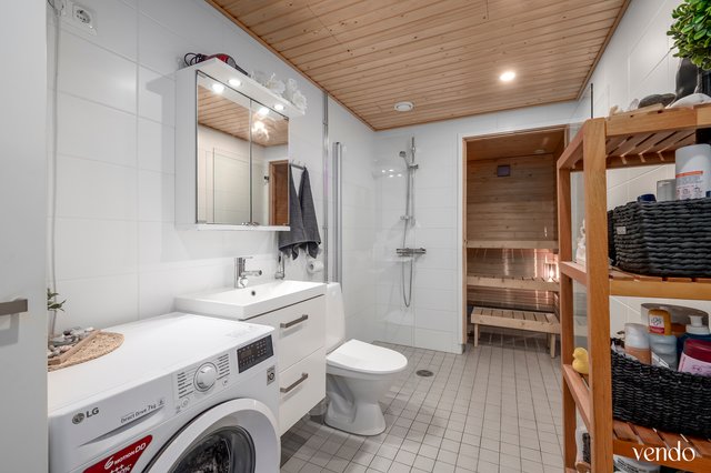 - WC-istuin, suihku, suihkuseinä, pesukoneliitäntä, lattialämmitys, pesuallas, peilikaappi, allaskaappi, ja bidee-suihku