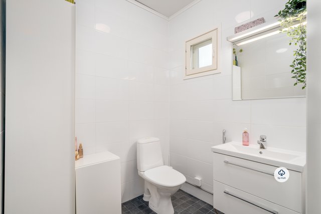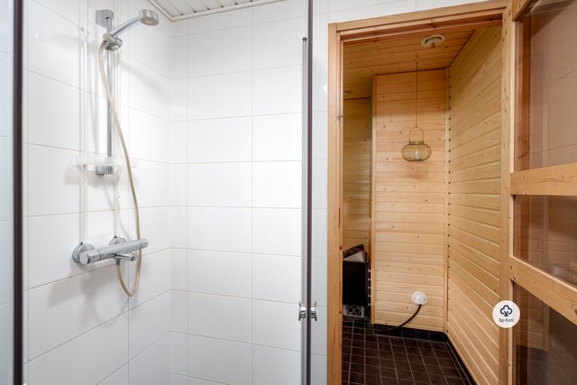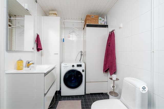 - WC-istuin, suihku, suihkuseinä, pesukoneliitäntä, pesuallas, allaskaappi, bidee-suihku, kuivauskaappi, lattialämmitys, ja peili