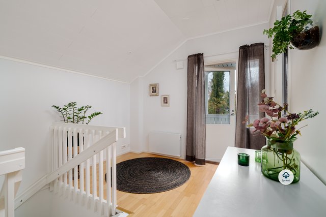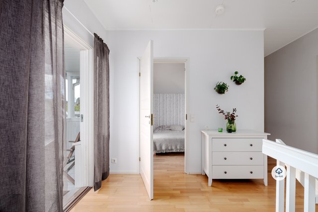 I övre våningen finns två rum till och ett modernt badrum med golvvärme och en egen bastu. Efter bastun kan du njuta på balkongen.