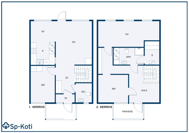 Alakerrassa on tilava ja valoisa olohuone, jossa lämpöä varaava takka luo tunnelmaa ja mukavuutta kylminä iltoina. Käytännöllinen keittiö on varusteltu nykyaikaisilla kodinkoneilla, ja sen toimiva suunnittelu tekee arjen sujumisesta helppoa.