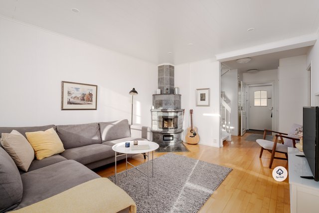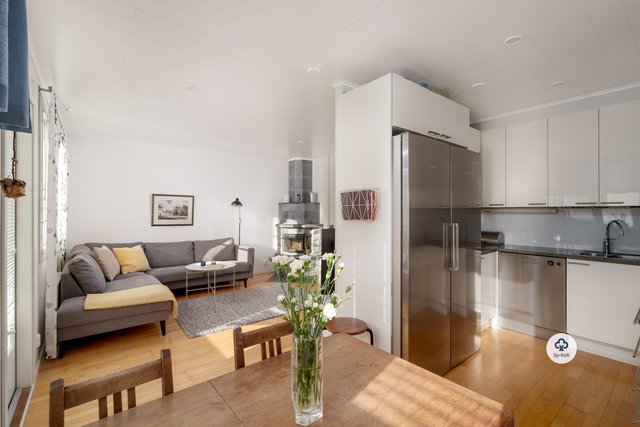 I nedre våningen finns ett sovrum och rymligt vardagsrum med värmelagrande eldstad som skapar mysig stämning under kalla kvällar. Köket är modernt utrustat och praktiskt planerat för ett smidigt vardagsliv.