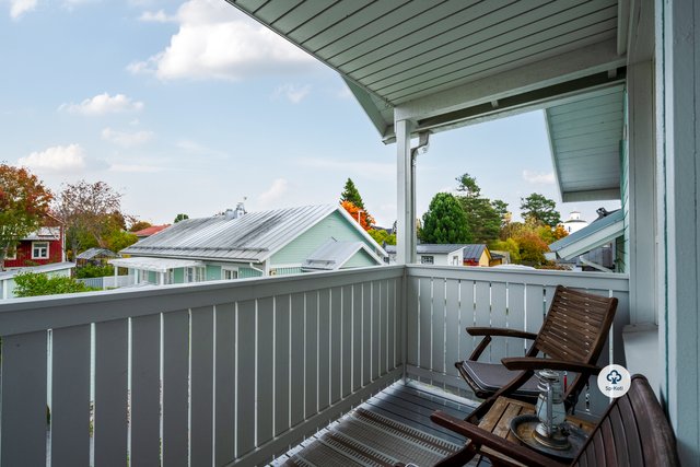 Yläkerran kaksi huonetta sopivat mainiosti makuu- tai työtiloiksi. Kylpyhuoneessa on lattialämmitys ja modernit varusteet, ja oma sauna kutsuu rentoutumaan päivän päätteeksi. Saunan jälkeen on mukava vilvoitella parvekkeella, josta avautuvat miellyttävät näkymät.