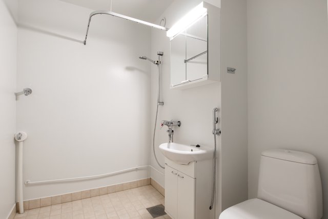 - WC-istuin, suihku, pesukoneliitäntä, peilikaappi, pesuallas, allaskaappi, ja bidee-suihku