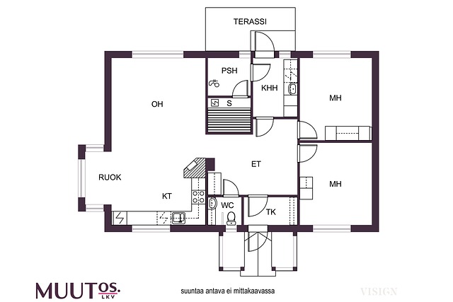 - Pinta-alat perustuvat myyjältä saatuihin tietoihin ja rakennuspiirustuksista laskettuihin arvioihin. Pinta-aloja ei ole tarkistusmitattu, mitattaessa pinta-alat saattavat olla ilmoitettua suurempia tai pienempiä. Hinta ei ole pinta-alaperusteinen. Rakennuspiirustusten mukainen kerrosala 102 m2 ja huoneistoala 86 m2. Asuintilojen pinta-ala on laskettu rakennuspiirustuksista ja siihen on huomioitu kaikki asuinkäytössä olevat tilat. Mikäli ostaja haluaa tietää rakennuksen pinta-alat suositellaan tarkistusmittausta ennen kaupantekoa.