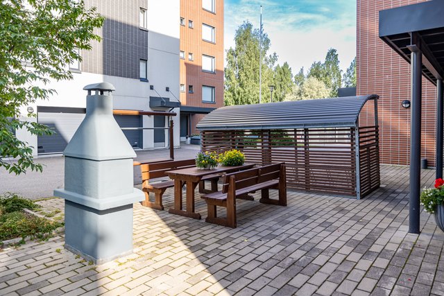 Asunnossa on tilava olohuone, jonka parkettilattia ja maalatut seinät luovat viihtyisän tunnelman. Keittiö on varustettu, jääkaappipakastimella, keraamisella liedellä ja astianpesukoneella. Kylpyhuoneessa on lattialämmitys ja oma sauna tuo luksusta arkeen. Lisäksi asunnossa on lasitettu parveke, joka tarjoaa lisätilaa ja mahdollisuuden nauttia ulkoilmasta ympäri vuoden.