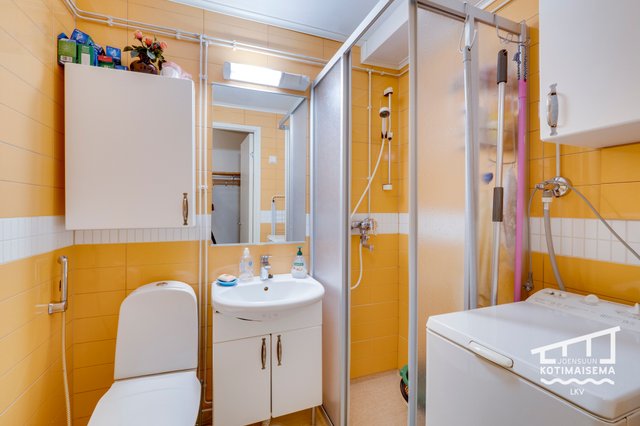 - WC-istuin, pesuallas, peili, allaskaappi, bidee-suihku, suihku, suihkuseinä, ja pesukoneliitäntä