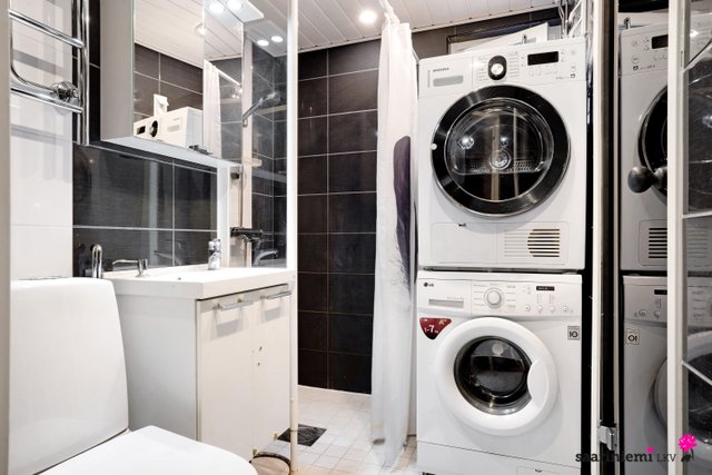 - WC-istuin, suihku, suihkuseinä, pesukoneliitäntä, peilikaappi, pesuallas, allaskaappi, bidee-suihku, ja tila pesutornille, pyyhekuivain/seinäpatteri