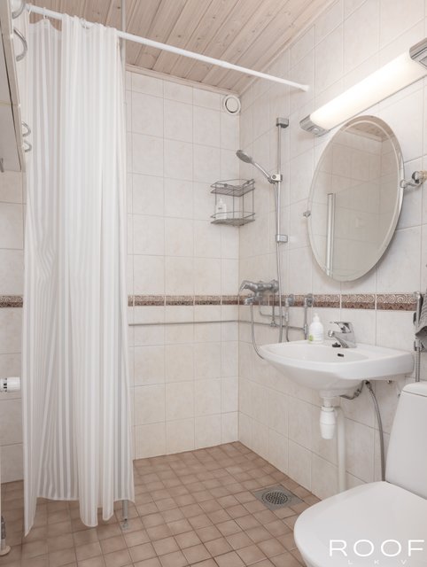 - Suihku, suihkuseinä, pesukoneliitäntä, allas, peili, wc-istuin, bidee Lattiamateriaali: Laatta Seinämateriaali: Laatta