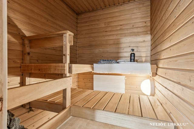 - Lattia: laatta. Seinät: puu. Saunan lauteet hiottu ja parafiiniöljytty sekä kiuaskivet uusittu 2025. Katto ja seinät paneelia, lasiovi. Lattialaatoitus on uusittu 2021 taloyhtiön suorittaman märkätilaremontin yhteydessä.